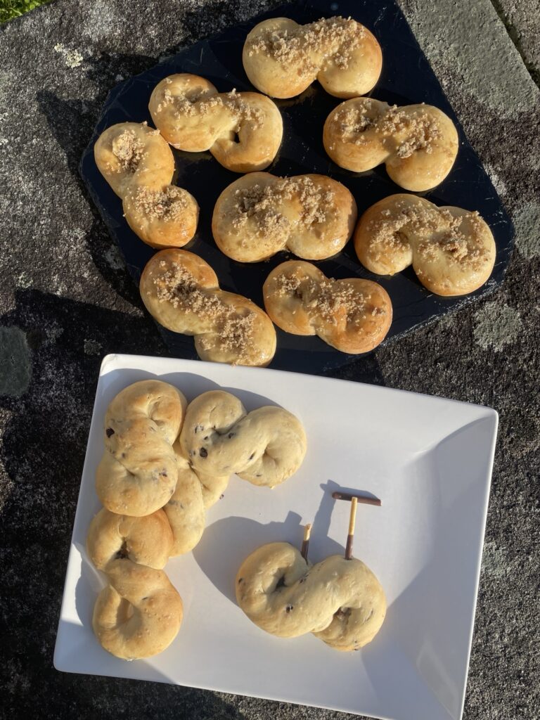 Hier, c’était la journée de la femme. En Roumanie 🇷🇴 cette journée ressemble un peu à la saint Valentin. Dans la rue, les femmes se baladent avec des 💐 à la main. Début mars, on s’échange aussi de petits bracelets d’amitié rouges et blancs. Et puis on déguste des brioches 🥧 en forme de 8, recouvertes de miel et noix… une tuerie ! Alors hier pour le goûter, c’était une adaptation de ces mucinici, aux pépites de chocolat 🍫. Miam 🤤 ! et puis de loin ça ressemble à des roues de vélo 😀